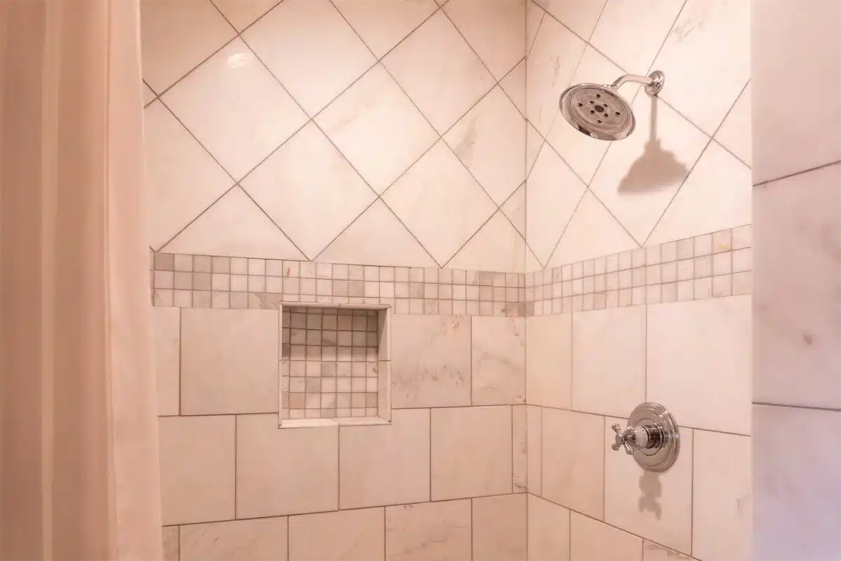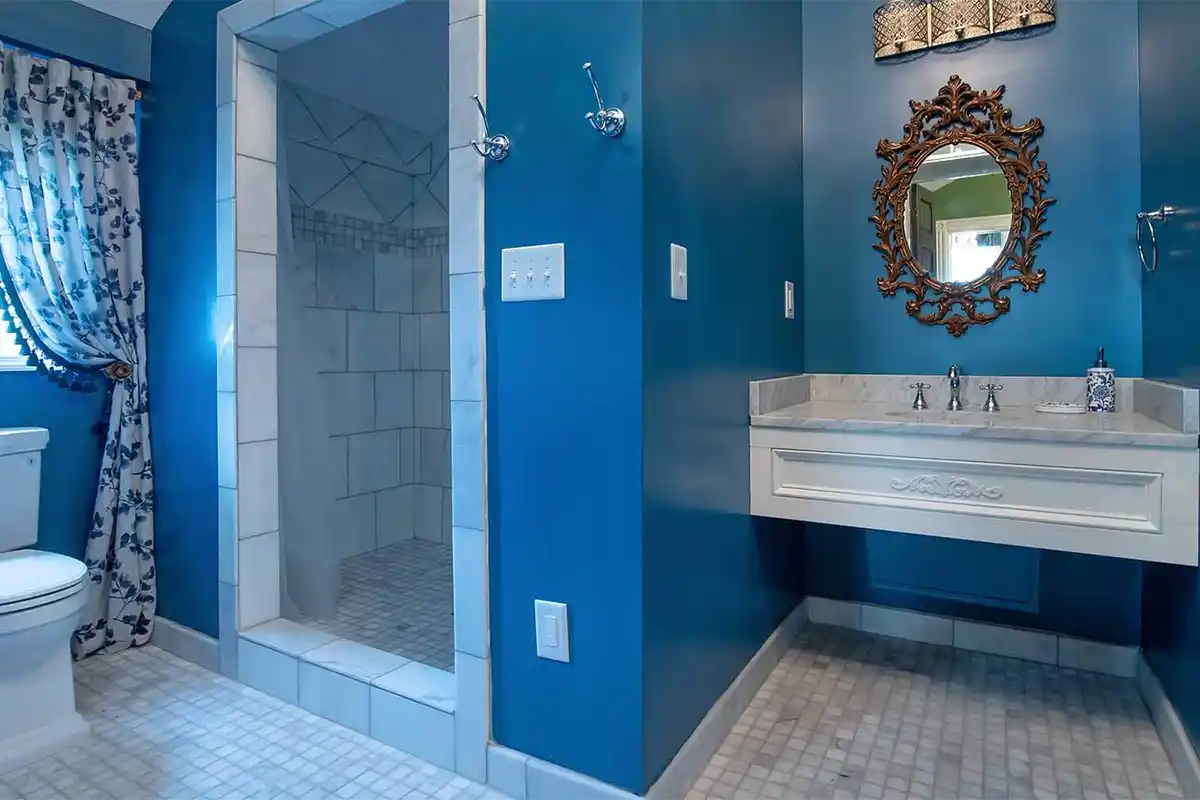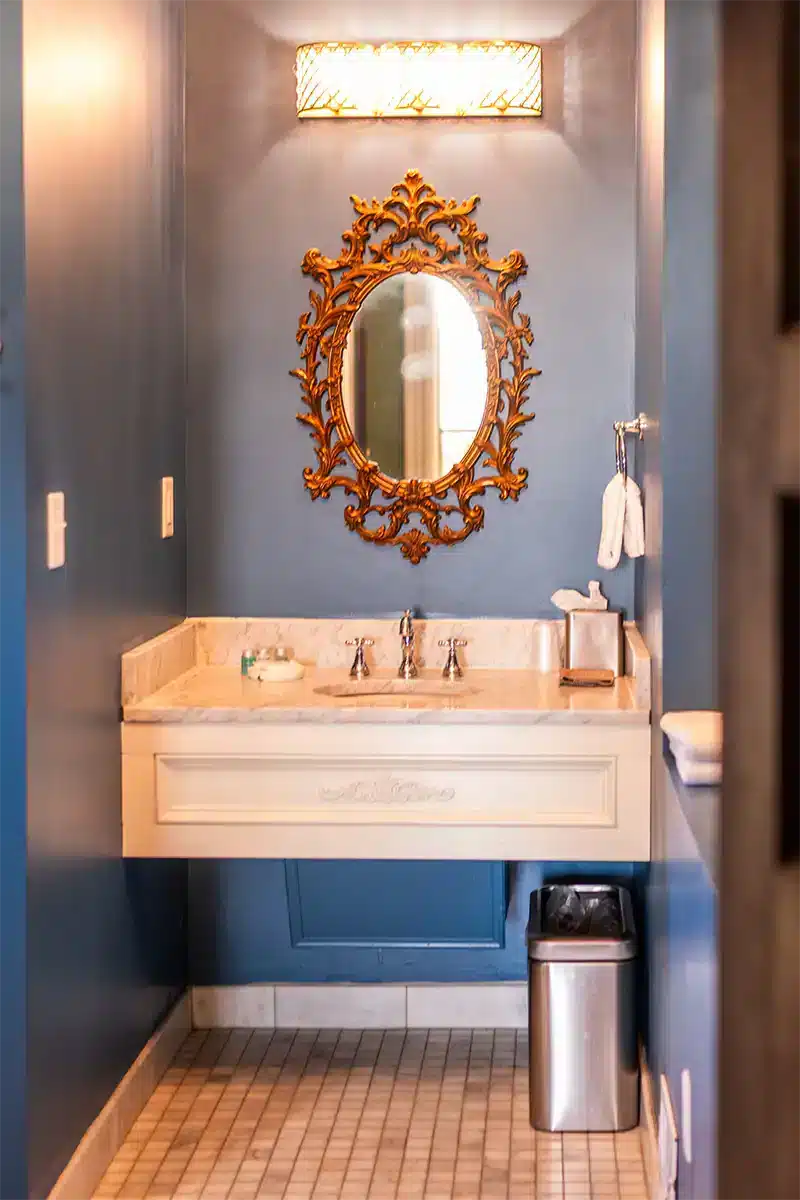 The Sapphire Room features a private bathroom located across the hall. To ensure your comfort, we provide plush robes for the short walk. The bathroom itself is a marble oasis with a spacious walk-in shower, promising a rejuvenating experience.
