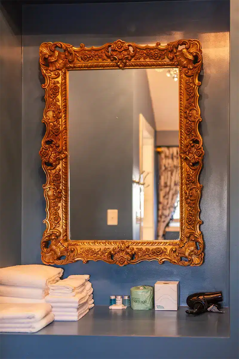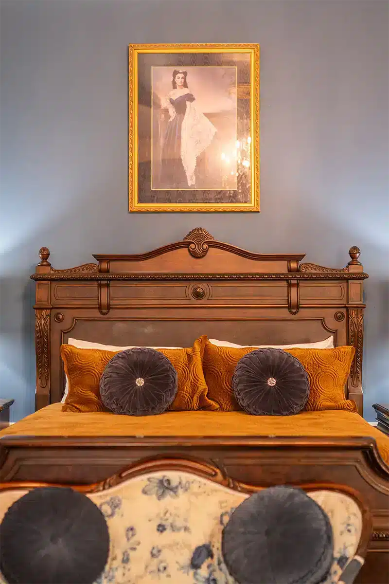 Step into the elegant Sapphire Room at Belle Air Mansion, located on the top floor of our historic mansion, where history and luxury intertwine. This stunning room, adorned with antique furnishings and rich sapphire blue decor, offers a luxurious king bed wrapped in our signature soft sheets and a cozy daybed for extra comfort.