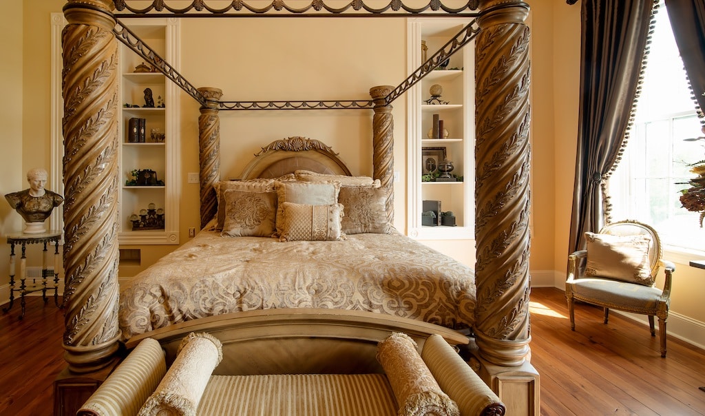 One of our most elegant and romantic guest rooms at our bed and breakfast in Nashville, TN, is the Bronze Tranquility room (pictured here), which is a favorite for those celebrating a milestone or honeymoon or couples on a romantic getaway. This 740-square-foot suite is one of the most spacious rooms, with an impressive four-poster king bed, fine furnishing, and opulent touches. The en suite bath is like your own private spa oasis with a separate makeup room, two huge vanities, a jetted tub, and a separate shower.