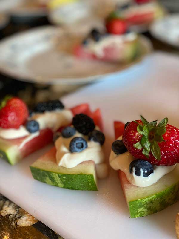 We serve a variety of breakfast options. Some of our specialties may include our French Toast Bake, Quiche, Breakfast Casserole, and Avocado Toast.