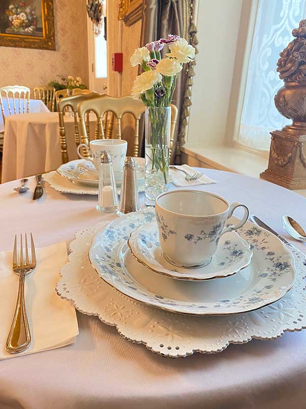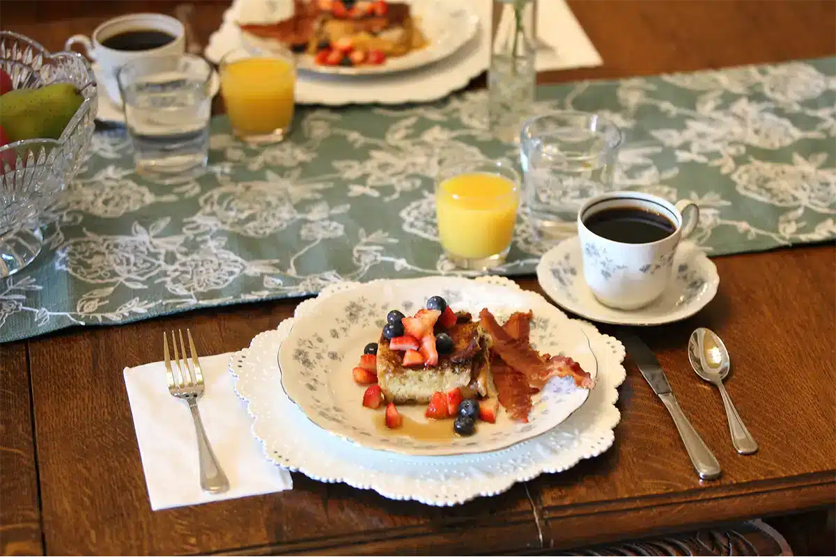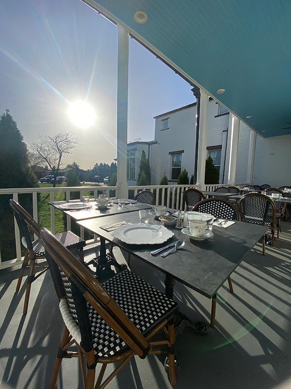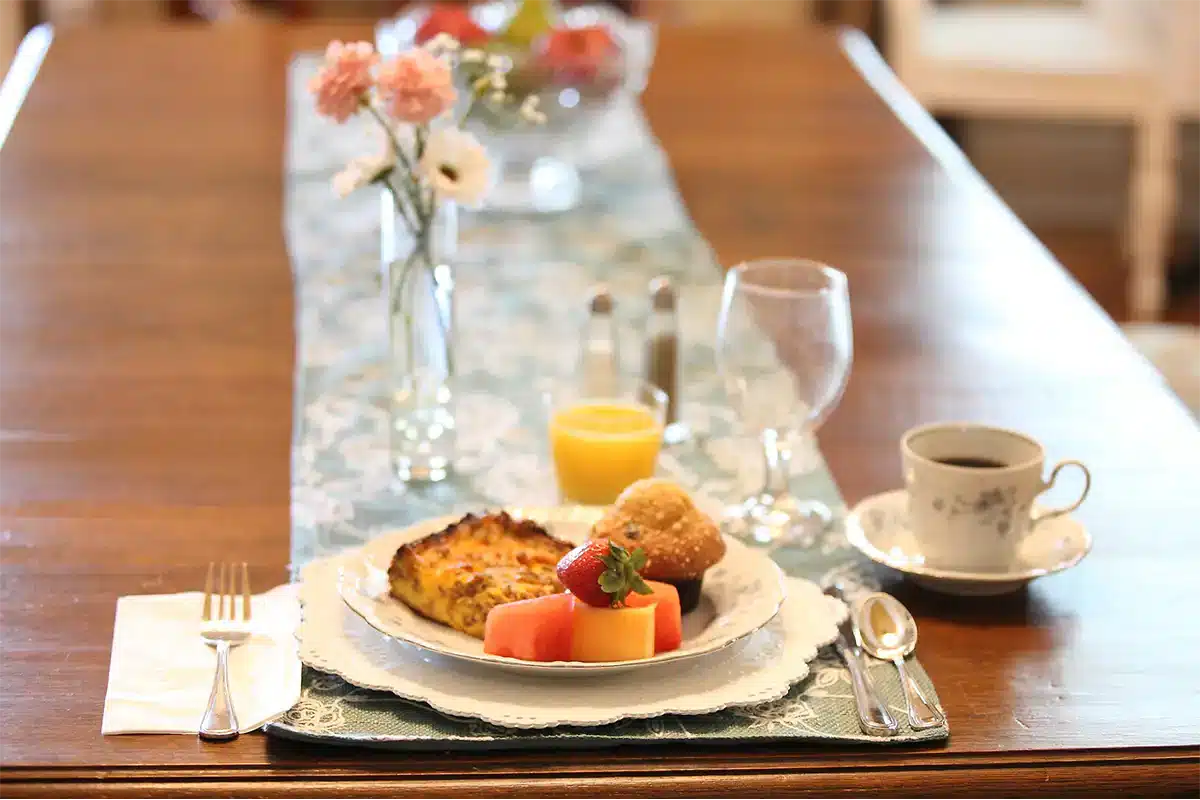 Join us each morning for a homemade Southern Breakfast, served in one of our Mansion dining rooms or outside on the veranda. Breakfast is included with all room reservations, including house buyouts. We hope you will join us! Our plated breakfast includes a main dish, fresh fruit, biscuits or pastries, juice, coffee, and tea. Options of yogurt, granola, and oatmeal are available. We are happy to accommodate dietary restrictions such as gluten-free, vegetarian, or vegan.